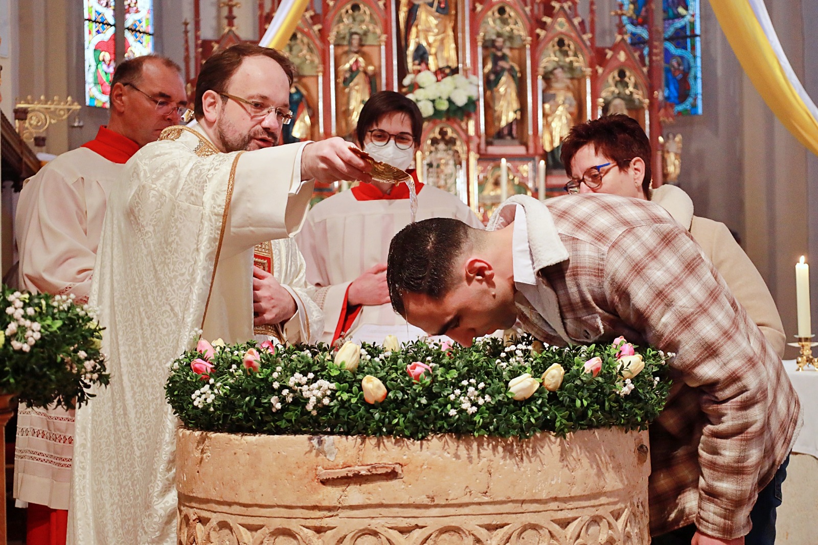 Tod und Auferstehung Jesu gefeiert In der tiefen Stille der Nacht zum Ostersonntag versammelte sich die katholische Gemeinde in der Pfarrkirche Mariä Himmelfahrt, um die „Nacht der Nächte“ zu begehen: vor der Sakristei loderte bereits
