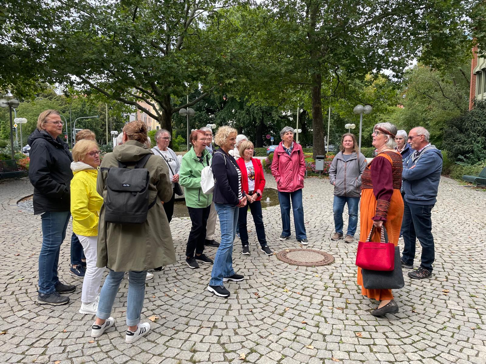 Gestärkt ging es am Nachmittag weiter nach Weiden in der Oberpfalz. Dort wartete eine Dame in mittelalterlicher Gewandung, die die Teilnehmerinnen zu einer spannenden einstündigen Stadtführung mitnahm. Sie tauchten in die Geschichte der Stadt ein, bestaunten die historische Stadtmauer, die Altstadt und die beiden Hauptkirchen: die katholische St. Josef Kirche und die evangelische St. Martin Kirche. Besonders beeindruckend war das Glockenspiel, das zweimal täglich mit bis zu vier verschiedenen möglichen Melodien ertönt.