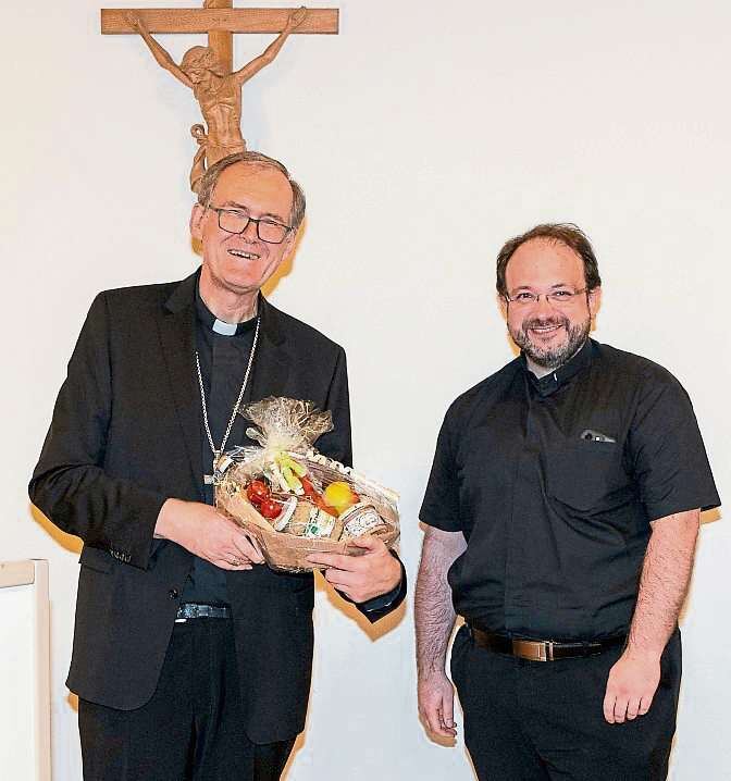 Mit einem Gebet beendete der Referent den Abend. Prodekan Pfarrer Marius Frantescu erzählte im Schlusswort kurz von seiner eigenen Berufung: Er hatte Vorbilder im Glauben und möchte nun selbst so ein Glaubensvorbild für andere sein. Dekan Pfarrer Jürgen Eckl dankte dem Referenten Weihbischof Dr. Josef Graf mit einem kleinen Geschenk.